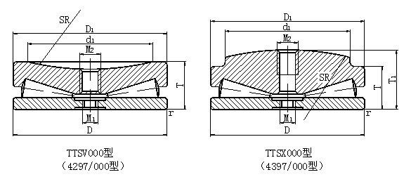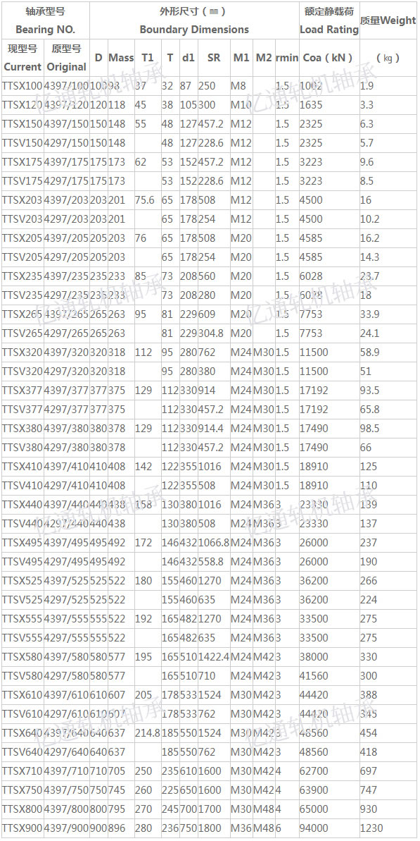 該類(lèi)軸承是專(zhuān)用軸承,是為軋鋼機(jī)壓下機(jī)構(gòu)專(zhuān)門(mén)設(shè)計(jì)的,軸承無(wú)保持架滿(mǎn)裝滾子,允許的轉(zhuǎn)速極低,軸向負(fù)荷能力很大,為滿(mǎn)足軋鋼機(jī)壓下機(jī)構(gòu)工作要求,該類(lèi)軸承的頂圈頂端加工成凸球面TTSX000型(4297/000型)或凹球面TTSV000型(4397/000型),以保證其調(diào)心性能,同其他相配合的異型端面接觸均勻,在壓下機(jī)構(gòu)相對(duì)軸承軸線產(chǎn)生一定傾斜時(shí)能保證軸承受力均勻。